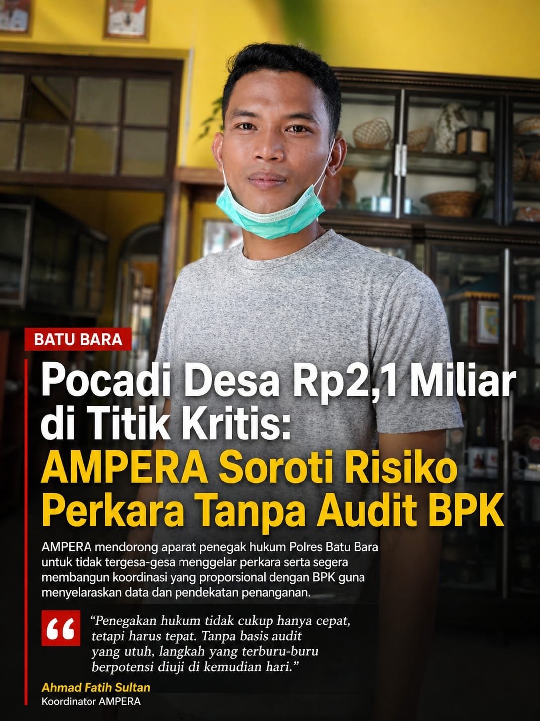 Dalam konteks itu, AMPERA mendorong aparat penegak hukum Polres Batu Bara untuk tidak tergesa-gesa menggelar perkara serta segera membangun koordinasi yang proporsional dengan BPK guna menyelaraskan data dan pendekatan penanganan.