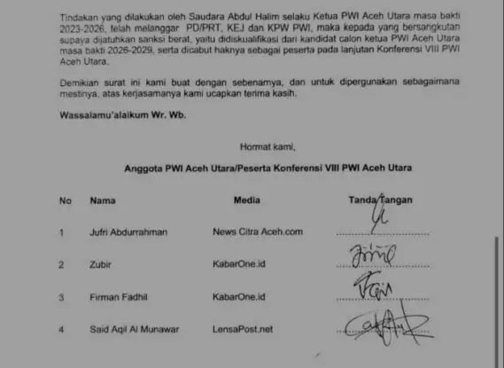 Surat ini ditandatangani oleh sejumlah anggota PWI Aceh Utara, di antaranya Jufri Abdurrahman, Zubir, Firman Fadhil, Said Aqil Al Munawar, Jamaluddin, Andri Syahputra, dan Dedi Muliyadi. Tembusan surat ini juga disampaikan kepada Ketua Umum PWI Pusat dan Dewan Kehormatan PWI.