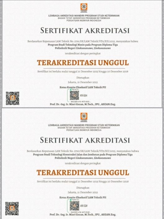Di titik inilah Politeknik Negeri Lhokseumawe (PNL) menempatkan capaian terbarunya: dua program studi diploma tiga, Teknologi Konstruksi Jalan dan Jembatan Jurusan Teknik Sipil serta Teknologi Mesin Jurusan Teknik Mesin resmi menyandang akreditasi Unggul dari Lembaga Akreditasi Mandiri (LAM) Teknik PII.